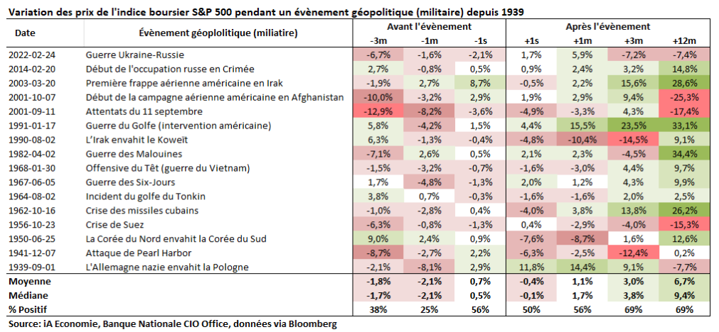 Le tableau ci-dessous présente les variations du S&P 500 lors d’évènements militaires qui ont eu lieu depuis 1939.